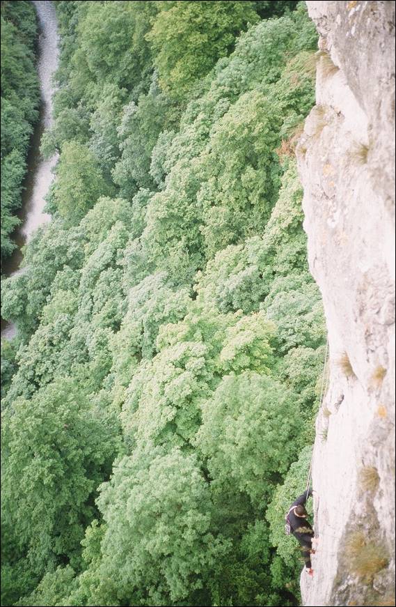 For me the premier limestone crag has to be High Tor. Some would argue it is the best limestone outcrop in the country, but how could it possible trump Swanage! On a side note I got a reply from Bob (who you’ll get introduced to in time) and he recalled taking an ice axe when climbing in Swanage to tackle the top outs, now why did we never think of that idea. High Tor is a serious crag with not much that isn’t given an E grading and deservedly so. Long steep and seriously sustained lines fire above the tree line with the River Derwent slowly flowing way below. It is not until you rap off the wall that the steepness hits you; you land on the ground from the top of some lines a good 5m plus from the base of the crag. A lot of lines go in two pitches, but that may have changed now that 60 and 70m ropes are more common. I spent a day on this awesome face with Sheridan, when we bagged some of the lower grade (for this crag) classics including Debauchery (below), Highlight and Original Route. There was however a line that I had my sights set on, and that was Darius. I was a little nervous as the day before we had passed the crag and I saw someone nearing the top of this route, we came past an hour later and they still hadn’t topped out yet. However, it is rated as one of the best E2’s in the country and up there with Left Wall in North Wales so I had to give it a go: