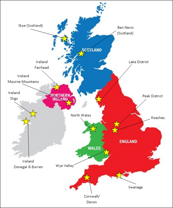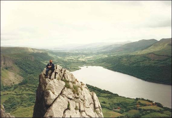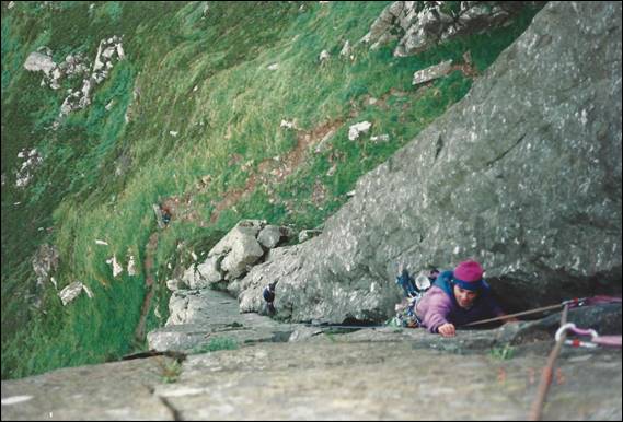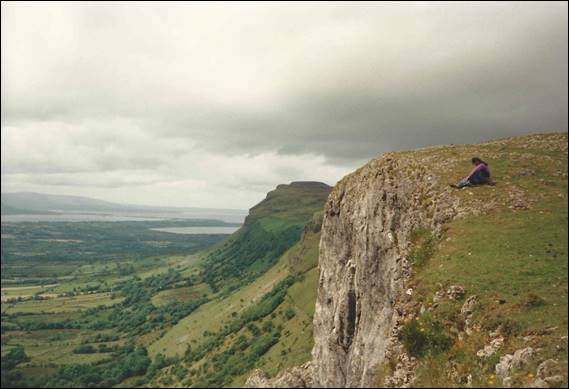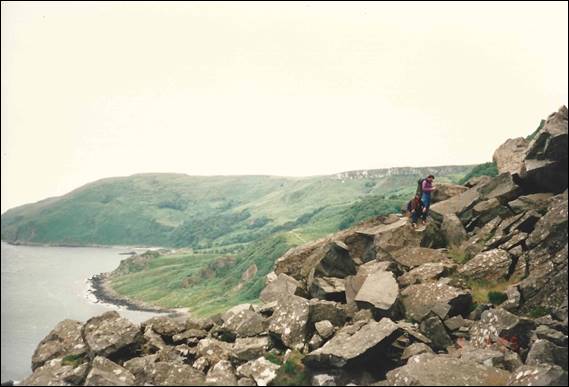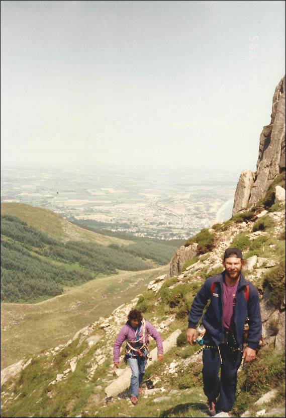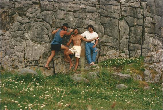 During my stint in the Lakes, Finton came to visit and we hatched a plan to have a bit of a climbing trip to Ireland. I don’t recall all the thinking behind it other than it seemed like a good idea. So one day I picked Finton and Tim up from the railway station, after they had come up from London, and we headed northwards to Cairnryan in Scotland. There we caught the ferry across to Belfast in Northern Ireland. From memory we planned an eight day trip including travel, and decided to start where we landed and then work our way north and round the west coast. We arrived in Belfast late in the day and were not sure where we would camp, the streets were barren, dark, grim and scary. As we drove past the police station it didn’t fill us with confidence, the place was surrounded by cyclone wire fencing topped with coils of razor wire, and to boot spotlights and cameras were placed at every corner. Not sure what to do or where to go we parked up on the street popped into a pub to ask someone and the landlord said we could camp in the pub courtyard. This was located behind two heavy wooden doors in which we could also park the car. The pub wasn’t too busy and we had a few beers to ease our nerves. There was a good crew to chat to, and we soon hit the sack sleeping in what felt like a barn. The next morning we thanked the landlord and headed out: