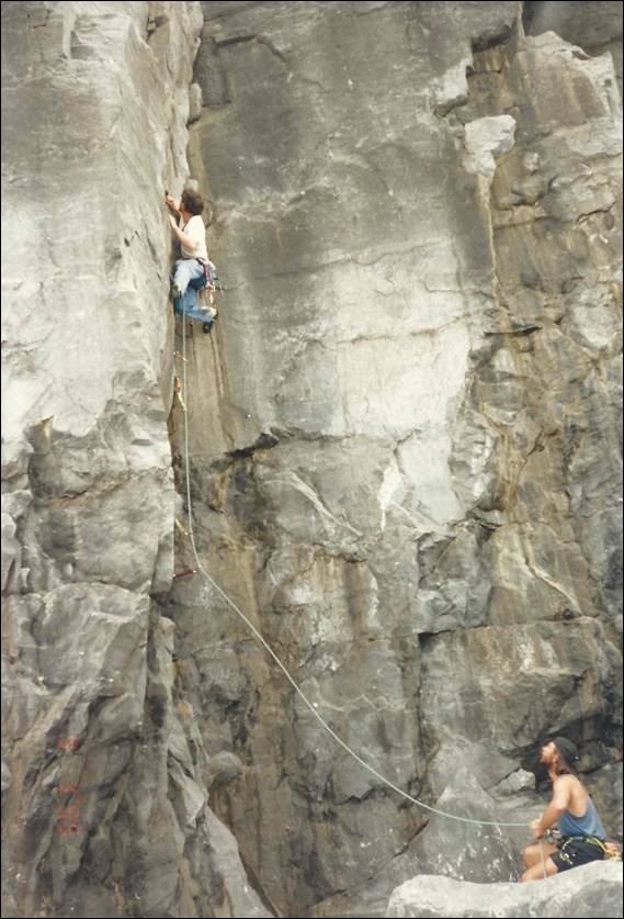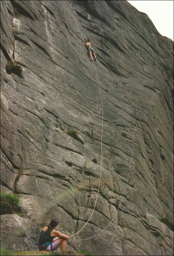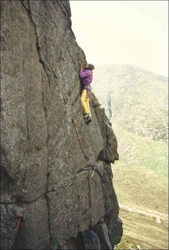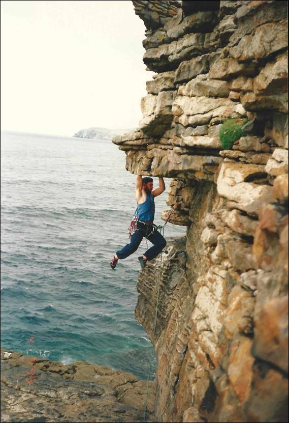That night we camped in Newcastle. We felt more comfortable being away from Belfast, it really didn’t feel an inviting place and being in this small town felt so much better. We stayed next to a brook in which we washed that evening. It was freezing cold and that was the last wash we attempted in the creeks of Ireland. The next day we packed up our tents and headed back into the Mourne Mountains. It was another one hour walk in but this time up gentle valley sides, with amazing scenes back down to the coast line. Our destination was Lower Cove, but on the way we passed another crag by the name of Buzzard’s Roost. On the central buttress back in 1994, which was only a year before our visit John Dunn had finally managed his project on a massive 55m tall overhanging prow, a single pitch going at what he claimed to be E10 7a. It was regarded as one of the UK’s most striking and famous hard trad routes. Since this time there have been a few repeats and the grade has been the subject of discussion, some saying E8, while the UK online guide gives in E9 6c. Dave MacLeod made the third ascent of this mighty route in 2006 a significant twelve years after the first ascent. He placed the gear after top roping it, and then afterwards said “If I had been sure the route was only 8a and so safe I would have tried it ground up, but I was still looking at a potential E10 and 8b/+ which I could never on-sight”. Regardless of grade we stopped here for a while looking up in awe, needless to say we then carried on walking: