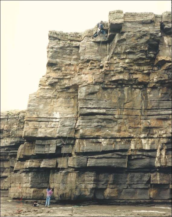 The morning came and we had decided on another relatively high inland crag, again with ocean views in the distance. This meant we were back to the bigger walk-ins with just over an hour. These crags were giving our all-round fitness a bit of a boost, but I feel that we may have been reducing the benefit a tad with the evening beers. The crag was about 30m high comprising a vertical south facing grey reef limestone wall, which featured mostly cracks, flakes and faces. The rock was generally compact and had both finger pockets and a rough texture that gave great friction. That said the climbing here was pretty technical in nature and the holds were described as often sharp, which could also be said about the grades of the climbs. On this day I only took a couple of images, we were mainly using Tim’s SLR and he was using slide film. Unfortunately this film got lost in the post when he sent it off to be processed, so there are no images of the climbing here which is a real shame, and I was particularly gutted about this. Finton started the proceedings and went for Sparrow which looked inviting with its solid flake and crack system. Nice climbing never too tricky and plenty of gear, which was both a great way to warm up and also fitting for the grade. I was next up and bumped it up a bit liking the look of Leda not only because of the line but the description that indicated it had an acrobatic crux. The holds were much smaller and the forearms could tell, and the crux really did require some contortionist moves a bit above the gear making for an exciting climb. Tim then wandered along and looked up and was drawn towards Last Of The Summer Wine. This route started up a slick corner to reach a horizontal and then continued up a vertical crack, it looked awesome but also hard. The grade indicated likewise but Tim was smitten and wanted to try it, he started well up the corner with great bridging that was sustained and made him work to stay on. At the horizontal he placed a piece at the base of the crack and then try as he did, he just couldn’t mount the break to get established in the crack: