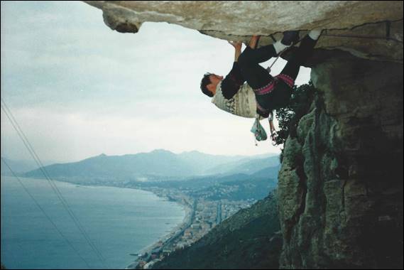 The intense climbing was hard on our bodies and fingers, and on this trip I was thankful for a rest day. Unlike my trip to Cornwall with Gareth, when our rest day included climbing. It also happen to coincide with New Year’s Eve, it is only as I write this that I remembered that. As we walked through Finale on this special night the town was quiet and still, and even the bars and restaurants closed early. This night in Italy and more so in these regional towns was a family night, not one to go out partying on. That didn’t bother us too much as during the day we feasted in bakeries and other delights and by night time were ready to head off. I have to admit to having felt quite ignorant on this trip, the other three not only spoke their own language and Italian but also English. I’d always known from my experiences in Holland that the Europeans tend to learn several languages and learn them well, that was not so much the case in England. During our day off we also explored the coastline walking about the limestone cliffs finding caves and beautiful formations. At one cave Fred for some strange reason decided that he wanted to climb over the arch. So he pulled his shoes on and started. When he got to the apex some 5m plus above the water, he got into trouble faltered and slipped. In the sink he went, and no one was offering to jump in after him. It was freezing cold and besides he popped back up and swam quickly to the rocks, shivering and keen to warm up: