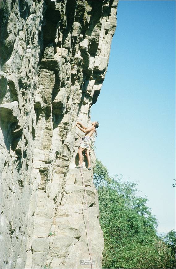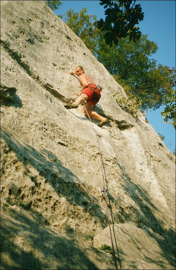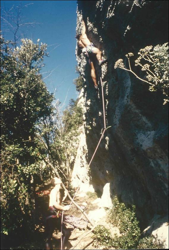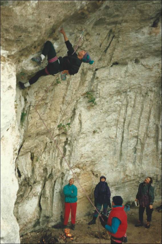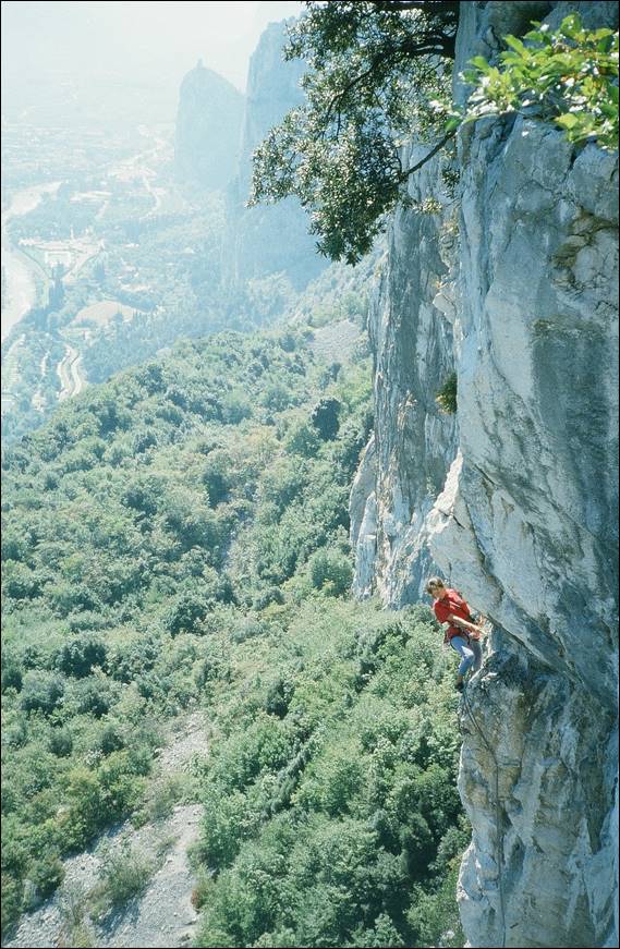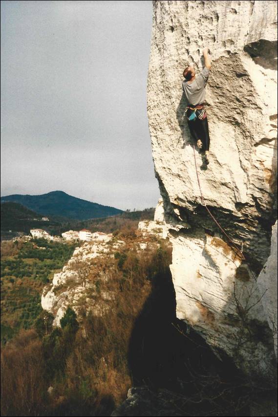 At this crag the sun did come out and it was a huge transformation. The rock felt more inviting and you didn’t come down shivering cold and thrusting your hands under your armpits. The white rock reflected the sun back at us and helped keep us warm, resulting in a few layers being shed. Below Matthaeus is leading Panino Al Prosciutto (Ham sandwich) at Setture Della Torre. No one followed him as this line was way beyond any of us at a lofty 8a+. He was a hard climber, having established up a number of routes at this grade and harder at his local Black Forrest crags. But he was also equally happy to have a bash at any climb and encouraged us to have a go, when he could see we were keen to push it a bit. When I climbed with him in Alice there was one boulder that we played on that required us to crank hard on a sharp finger lock, I backed off wincing while he pushed through the pain barrier and made it up. He told me he had met and did a little climbing with Wolfgang Güllich, and it was him who had instilled this approach of blocking out the pain and pushing through. At the time I had no idea of who he was talking about: