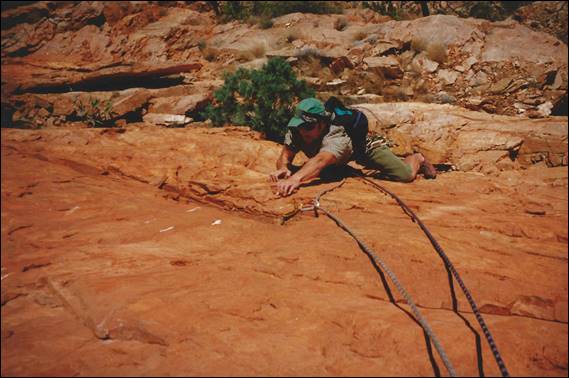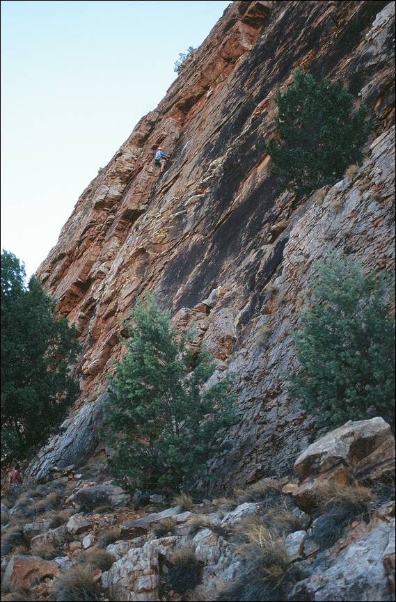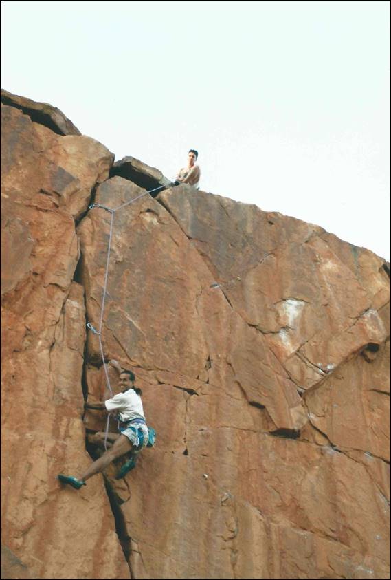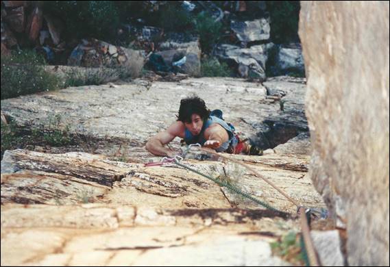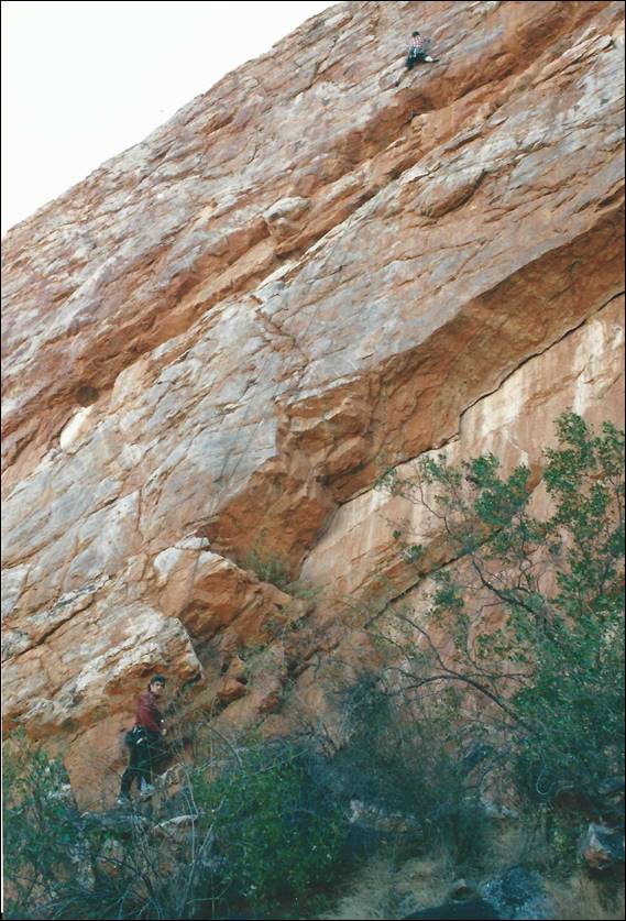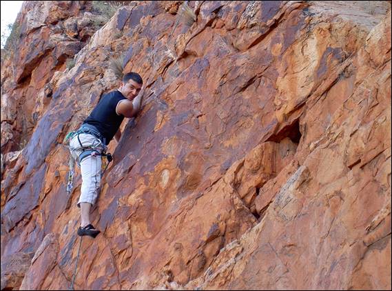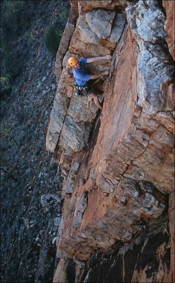 My first outdoor climbing experience in the Alice, since I travelled through the are during my 94 holiday (mentioned in my write up about Italy), was at a crag known as the Quarry. This wall provided an uncharacteristically steep and clean face, which happens to be located on the side of a road that leads to an old quarry. Even more unusual for the area is the fact that this 15m crag has a significant number of bolted routes. Left Foot Screaming looked for all intent and purposes a doable traditional line, although it did have one carrot at what I guessed would be the crux. Doable it was not and I ended up having to top rope the route, something that was out of character for me. Even with a top rope up I had to step even further into, what I felt to be, the dark side by hang dogging and piece-mealing my way up the climb. While muscle memory built up from many attempts over the years helped me to be able to lead it cleanly, it continued to prove a mental and physical challenge for me. Below is an image of me seconding Mark up the awesome Hyber Berger that is on that same wall at the Quarry, this climb will get mentioned again later as will Mark:
