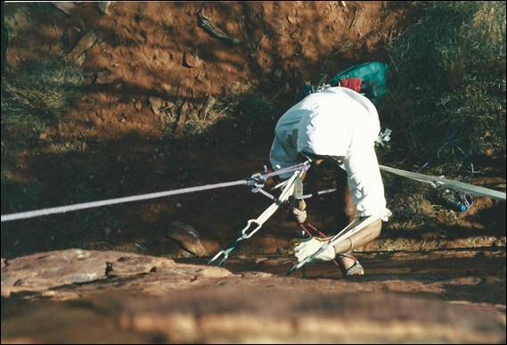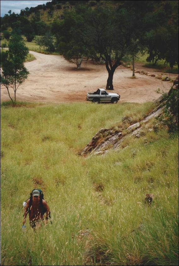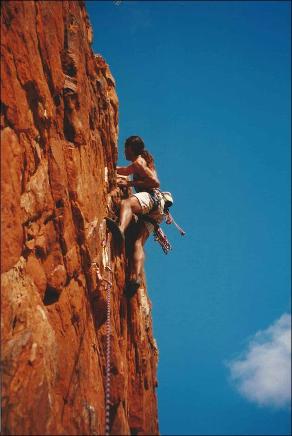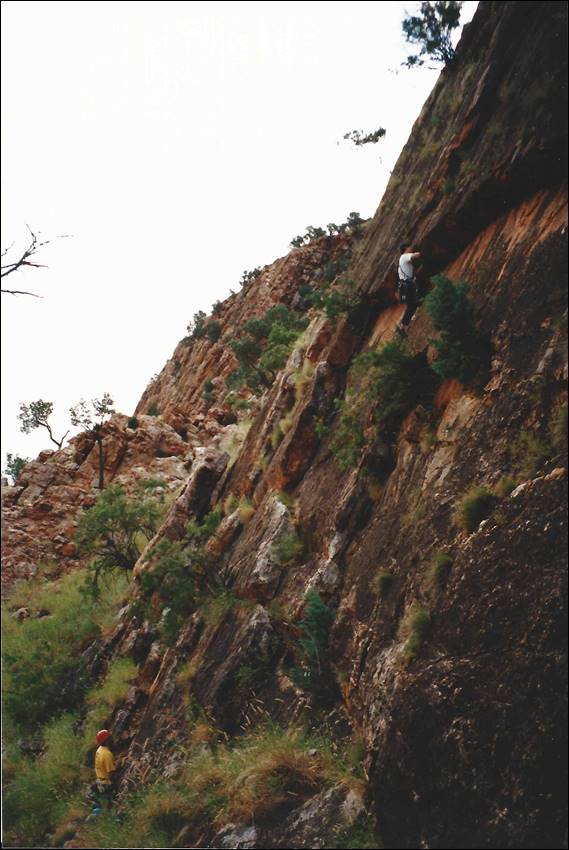 After this initiation of centralian rock I was very keen to step back to my preferred style of climbing, traditional ground up. It didn’t take long to meet up with local climbers and in a town of less than 30,000 people I was amazed to find groups of climbers who knew nothing of the others around. The fragmented climbing scene had also led to an assortment of climbing records floating round. All up there were about 200 routes listed. I was immediately immersed in the local climbing scene and was encouraged to help set up a climbing club, not so much a club really more of a collective voice to tackle the many access issues that I was to find out about. The climbing club never eventuated to anything, in fact after I put together a local newsletter people realised I was serious about it and most of them seemed to lose interest in the idea. Similarly the tour business turned out to be a lemon, it made no money and didn’t keep me that busy other than sitting round waiting for work. This meant that there was time to climb and I soon gained a reputation for being the person who would be available to climb at the drop of a hat, and with all the contacts I had made I was never short of finding a keen partner to get out with. Doug was one of the people that I first started to head out with, he worked at the US base called Pine Gap that has recently hit the news as being a spy base. We had regular trips out to Emily Gap during those early days, when the grass was tall and green: