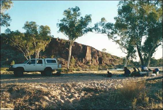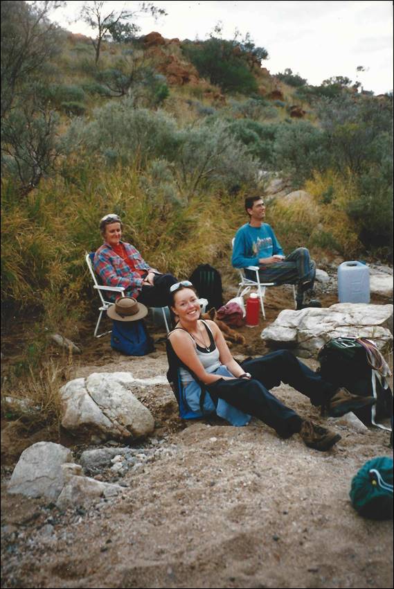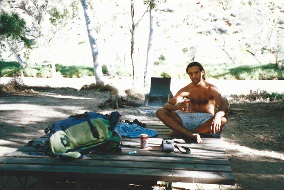 I got ahead of myself a bit above so going back to when Lisa came out to live in October 2000 I had already decided to throw the towel in on the business. So when she came out the first thing we did was move into a one bedroom apartment, then I left the business and was very glad to have that behind me. Alice is an amazing place for work, there were always heaps of jobs and you could diversify into so many different roles. This meant we were both soon employed and could find free time to explore the awesome countryside. Such as the very western end of the ranges where Mount Sonder the highest peak sits (below). We have been here heaps as it is near Glen Helen and 2-Mile another stonking place to set up for outdoor adventures. For our first New Year’s we hiked up this lofty peak leaving at first light and getting down by early afternoon in a stinking 44 degrees heat. When we got down we found a waterhole and immersed ourselves in it. We drank a welcome beer as we also savoured the well-deserved cool soak: