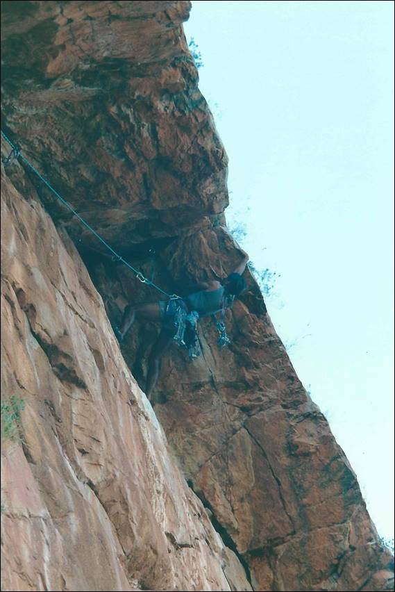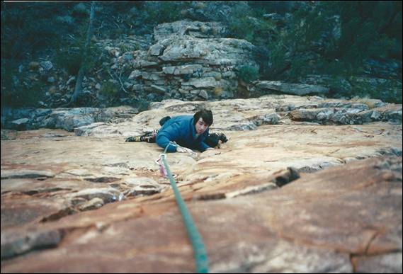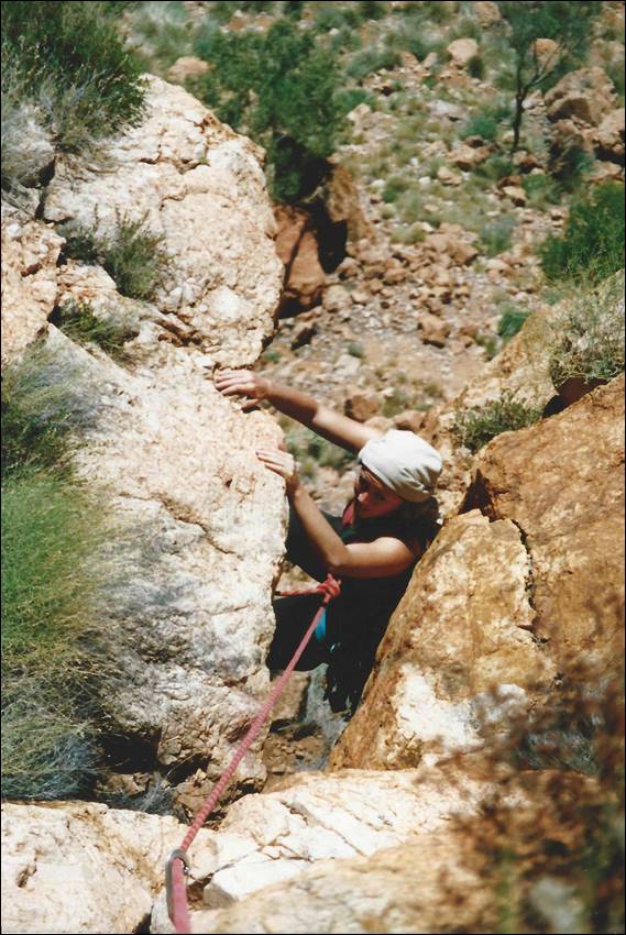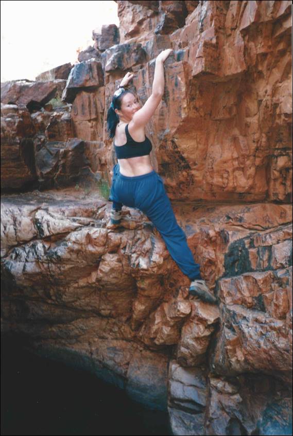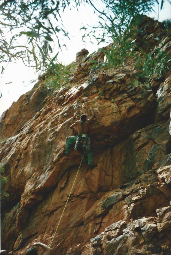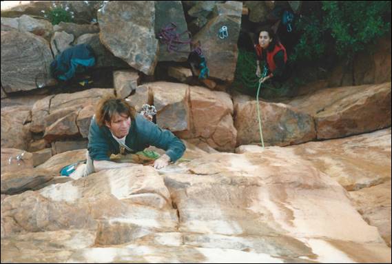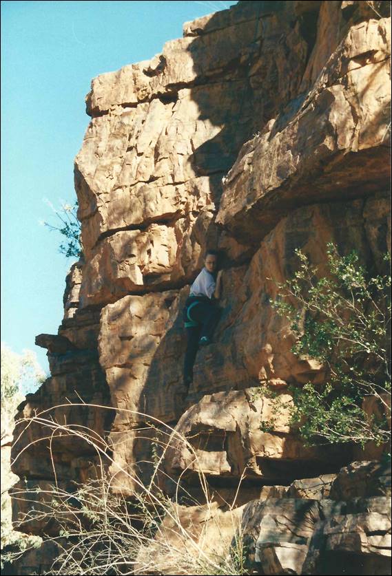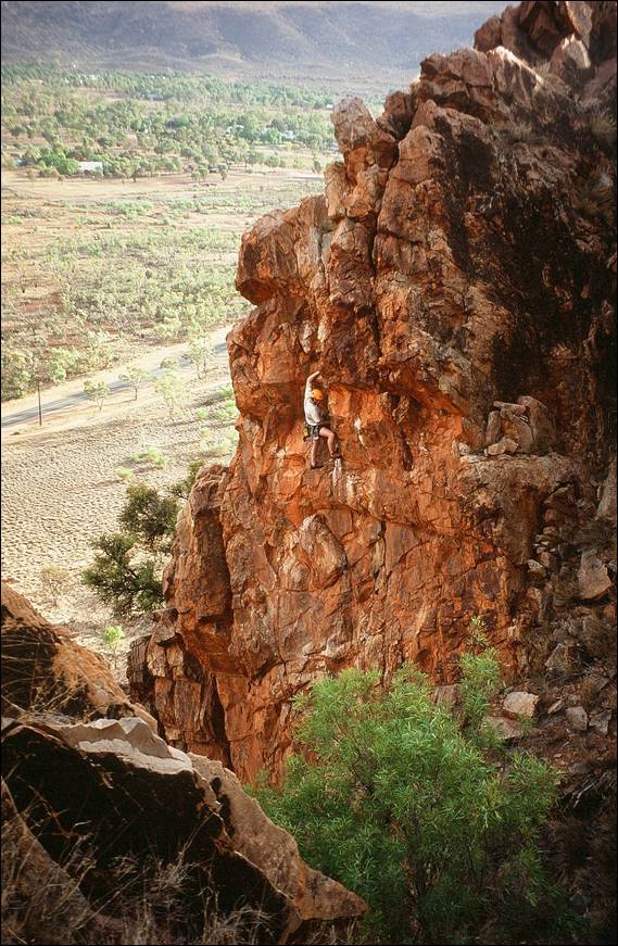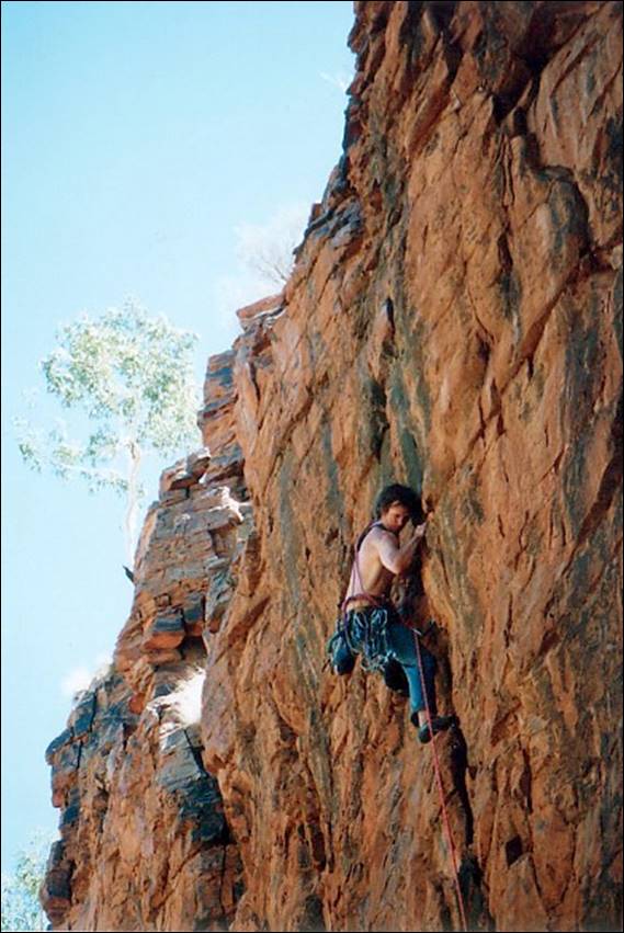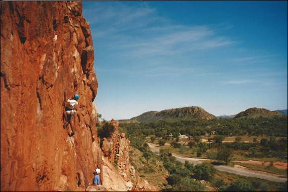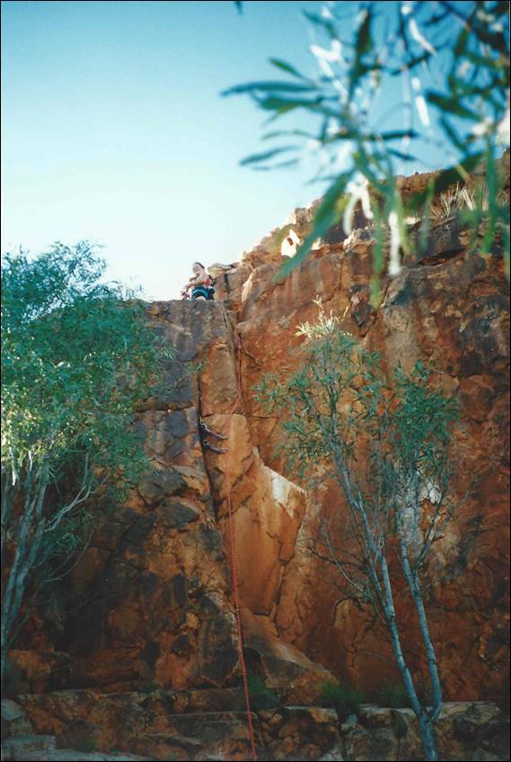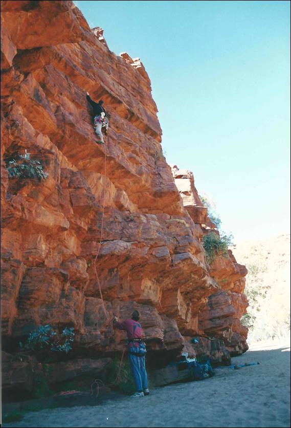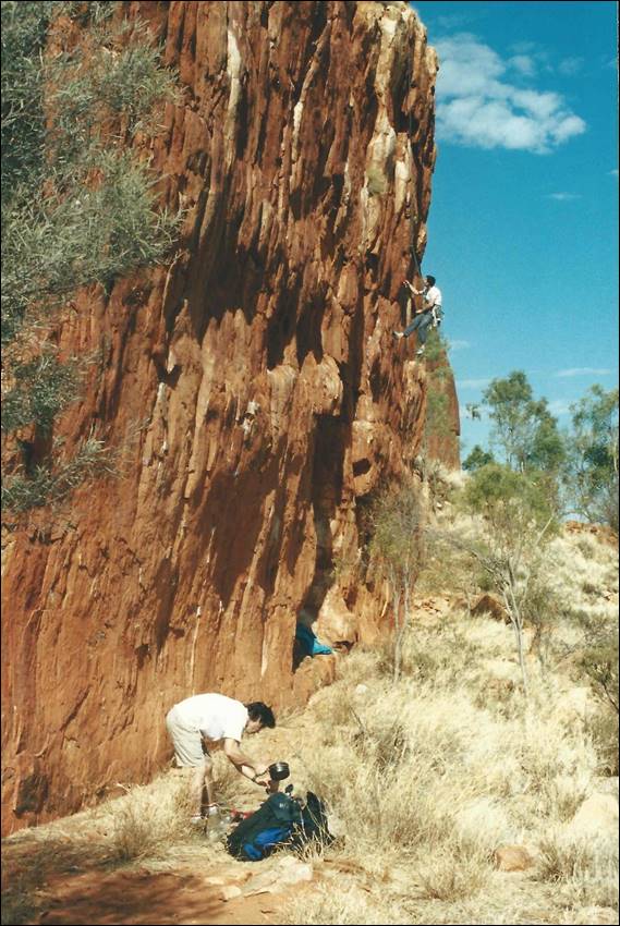 Alice Springs is a very long way from the nearest major town. Being so isolated it needs to be, and is, very well serviced. It is a pleasant surprise to most who venture this way to find that Alice Springs has just about everything they need. I was amazed to even find a decent sized indoor climbing wall, for which we need to thank a small group of very enthusiastic climbers. They secured funding and supervised the building of this wall back in 1996, which was run by the local YMCA when I got there and it seems that it is still in use today (according to their website). It was an amazing wall some 10m high with overhangs, vertical walls, corners and slabs. To boot there was also a 25m low level boulder wall made up of rocks stuck to a breeze block wall. It was the perfect place to train and meet potential climbers. During the first six months of my stay Lisa came out for a four week stint, to see if she liked Alice (and me) enough to move out here. During that visit she was introduced to the climbing crew and we had a social get together at a local crag called Charles Creek: