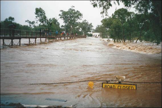 On this first trip to Trephina I also remember having the opportunity to climb in weather I was more accustomed to. I had arrived in the centre at an unusual time when the rainfall was three times the annual average. There was a low mist and dampness on the rock, and even more strange for the area there was water flowing through the usually bone dry gorge for an extended period, as shown a couple of images down in which Sam makes the first ascent of Mortal Thoughts. In the first two years of living in Alice Springs we were fortunate to witness two very wet years. I’ve slipped in this image of the usually dry Todd River that runs through Alice Springs, we got to see this kind of sight a heap of times in those early years. Across the water you can see Casa Nostra the Italian where Lisa got her first job, we used to call it the Cosy Nostril: