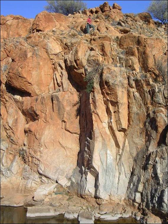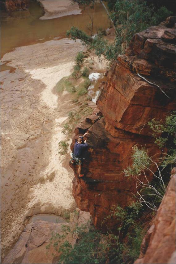 Two other climbers who turned up in late 2002 that are worth a mention were Karl and Claire, they hung about for about six’ish months. Just in case this email gets round they were not a couple! They climbed well and were keen, so I made use of their talents and got them to repeat a mob of the new lines that didn’t get too many ascent. This helped refine a few grades and provided a bit more confidence for when I finished the guide. In their short six months they got a great tour of the area including all the main crags and a few other places. Claire wasn’t afraid of air time and she would often push herself to the edge. Karl was more cautious and didn’t go as hard but had a cool head and kept calm in dangerous situations. I have horrible memories of belaying him as he attempted Stitching Time, which will get a mention later. He took his time and it was getting dark, the mossies were coming out and I was standing on an ant infested ledge. One of the most uncomfortable belay spots I’ve ever had but I daren’t fidget too much as he was very focused on this line. I’d sent Garn up it once and he took a massive backward fall. Karl didn’t have as big a fall, and I wonder if it has had a clean second ascent. I hope so as it is a wicked line. Karl loved Glen Helen and we spent a few days there. Below he is belaying me as I did the second ascent of another one of my creations, Long Drop. Guess what I did before this route from the ledge high above the ground:
