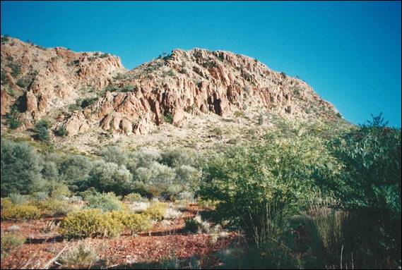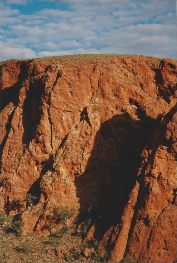 Now I keep on talking about access issues and a big one was related to Aboriginal land and/or heritage sites. I had decided not publish detailed route information of climbing in these areas but did detail the areas and names, indicating they were off limits, to discourage people from repeating these routes. Some climbers have lived and worked on Aboriginal land over the years, and in so doing have had the chance to build up trusting relationships with the Traditional Owners. Subsequently, they have been able to get permission to climb in areas that others can only dream of going to. Some of the images I have seen of these areas are gob-smacking. I have also been a bit guilty at times of doing the wrong thing, which I didn’t realise until after the event hence the routes didn’t even get in the guide. On two such occasions, both with Dave, were out the back of Glen Helen. Dave was a bush doctor and would often be out in the river bed sharing a handbag (i.e. cask of cheap red wine) with the locals. He was told about and given permission to go to places and on occasion took us with him. Below is one place and on arriving we got a good feeling and it seemed to welcome us, it may sound a strange thing to say but I’ll stand by that. We attempted the route below but failed in cleaning it, an epic line and sooooo good but we never returned to this spot: