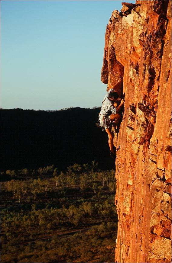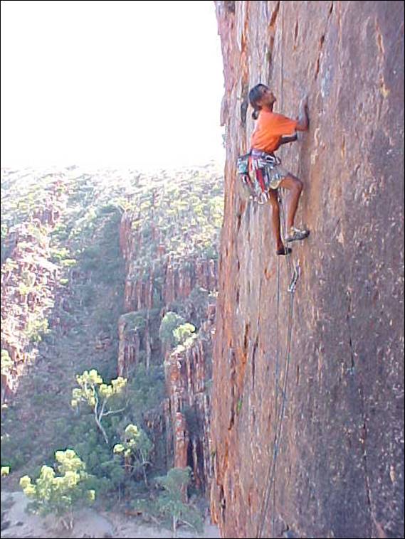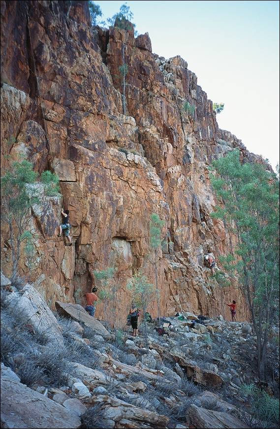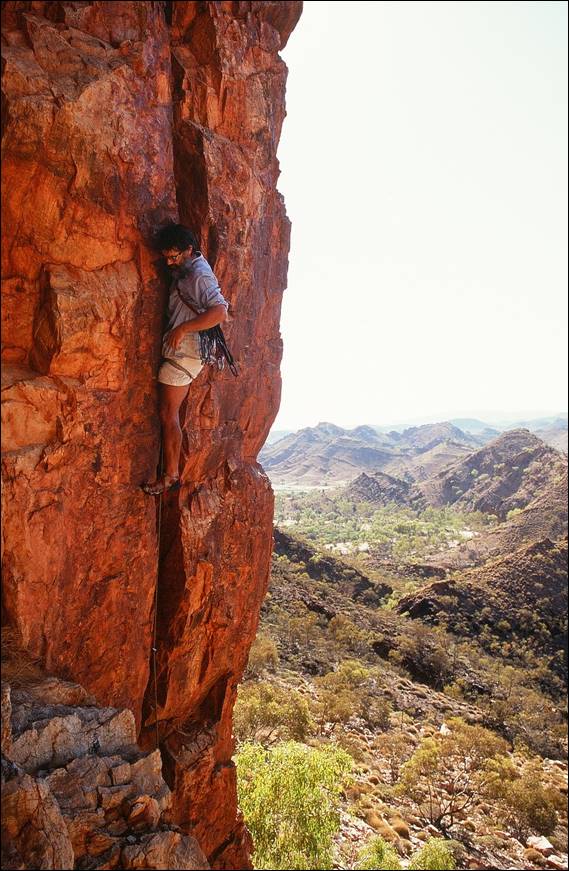 My eagerness to ensure there was some cohesion in the climbing community continued, and soon I was getting involved with access issues. Keen to make sure that the scrappy but fun slab at Emily Gap was not the only place that we could legally climb. A new Land Management Plan was being formulated for a stretch of the ranges that went for some 20km west from Heavytree Gap, in Alice Springs. Sure enough the draft indicated the little slab above the Emily Gap car park was earmarked to be the only place where climbing was to be permitted in the specified area. Climbing had occurred in the ranges along this area for over 30 years and access to a great deal of quality lines hung in the balance, such as the great Here Comes the Sun which Wassa is leading below. So a couple of us spent many hours pondering over the best wording for a three page submission to try and open up the areas more than just this one slab. We included the safety issues, quality of rock, non-invasive nature of climbing and everything else we could think of:
