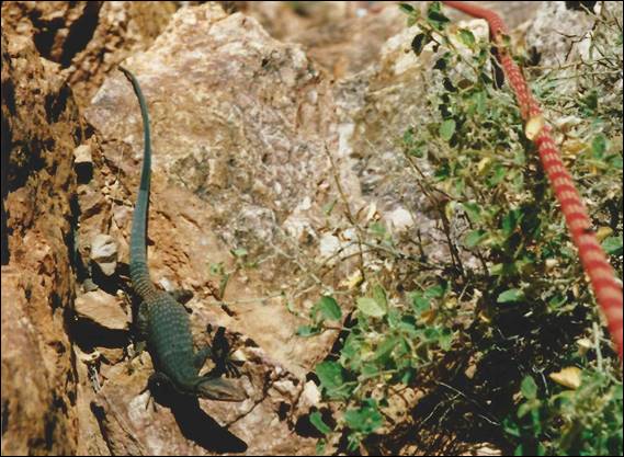 There are many other creatures here that some people would lead you to believe mean you nothing but harm. I would not agree with them, and would go so far as to say most of these creatures would rather stay out of sight and lead a peaceful life. I actively searched out the many reptiles but never saw a single snake in the wild, plenty of lizards of all sizes including a Perentie (the largest monitor lizard or goanna native to Australia) one of which that was some six foot long. When Jason Geres came to work in town we both felt that work should not take over life, so while he was here we broke up the working week with a Wednesday morning climb. On one occasion we bivvied out the night before, and it was then that he had a less than friendly encounter. We camped at the base of The Unknown, a broken set of crags that had some classics on them such as After a Little Spanking, which Garn in his homemade harness (constructed from an old car seatbelt) made very short work of due to his amazing ability to jam any size or shaped crack: