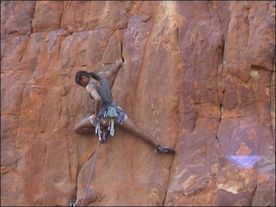 We also got stronger and more confident, starting to occasionally venture to the Quarry Wall to see just how far we had come. Left Foot Screaming was still an onerous proposition but we started to include the direct finish to add that little bit more of a punch. However, another climb on this wall that really must get a mention is by no means the hardest but one of the classics. The brilliant Hyber Berger that I am seconding Mark up early on in this email, comprises a traditional crack that sadly isn’t very long but delivers a challenge on solid rock with gear to boot. This climb is the favourite of number of local climbers past and present and has without doubt seen more ascents than any other route in Central Australia. I have led and seconded it myself probably close to 100 times and never ever got bored on it. It was the traditional way to warm up before trying the more challenging lines on this steep crag. While we were getting stronger Lisa was also climbing really well (even though to this day I am sure she doesn’t think I meant it) and her ascent of Nowhere Left to Turn below was particularly impressive. It was also a tad concerning as it was the route that I reckon she place the worse gear I’ve seen, except for the higher gear which is where it got spicy: