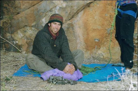 The most prolific climbing activity while I was in Alice happened from mid-2001 till the end of 2002. This is when Jason, Mark and Pat were in Alice Springs at the same time. It was with these three people that I started to train, both at the indoor gym but also at the Quarry Wall. This time round Mark had an extended stay, opting to hang out for almost a year. As time moved on we grew much stronger and more confident than before, so the number of harder lines established increased. I’ve mentioned a few areas above and will touch on some others below but most notably we developed the crag immediately left of the Quarry Wall. It was a wall that obviously had great potential but the slightly overhung start, seemingly devoid of holds, followed by a steep headwall had scared off any previous would be ascentists (note Jason pouring the hot water as the tradition of a crag brew had followed me from the UK):