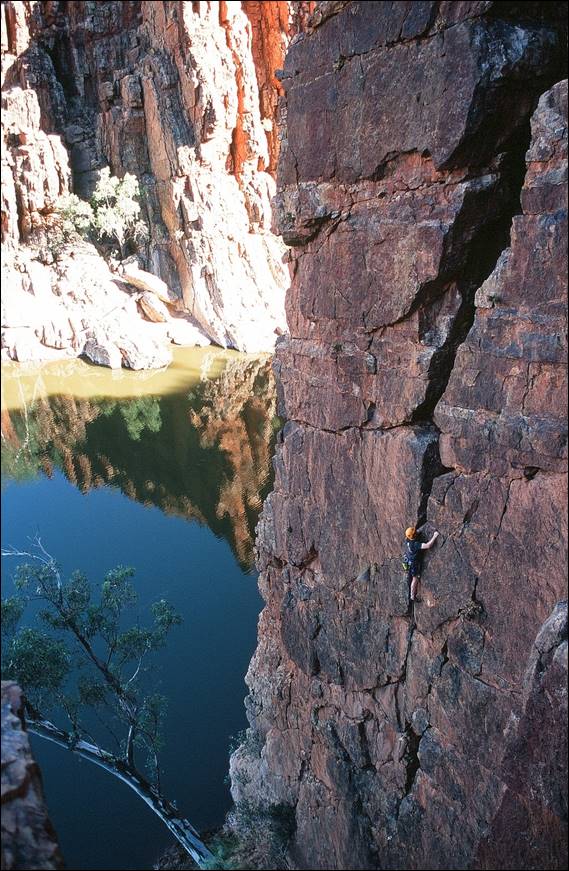 Below is the second place that Dave took us and a few others, it was a hike in and there was a huge waterhole and a splattering of broken crags. We didn’t name the route he is climbing but I can say that he is being belayed by The Object of Dave’s Desire… The Beautiful Ragni (sorry that was an in-crowd joke but I simply couldn’t resist). When we got there and both Lisa and I felt uneasy. We stayed the night but didn’t sleep well and were pleased to see the back of that place. Lisa and I strongly believe a place will let you know when you are not welcome and this place made our skin crawl. For the guide I spent a lot of effort ensuring I had current and accurate information about access to each location. I made contact with relevant land managers including station owners; the Department of Lands, Planning and Environment; Parks and Wildlife; Aboriginal Areas Protection Authority and the Central Land Council. It would seem that no one was prepared to allow open access for any activity, let alone climbing. There was an obvious risk in publishing the guide, but still I felt it was the right thing to do. In view of the majority of recorded climbs being in National Parks I offered assistance to Parks and Wildlife to help draft a Northern Territory policy on climbing. The person in charge of Parks in the Northern Territory had no issues with climbing, in fact said he felt it was a healthy and worthwhile sport. While we discussed how I could assist it unfortunately never eventuated to anything, but not through lack of trying on my part: