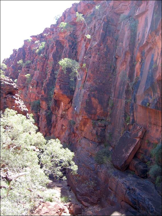 Writing the guide was easy; back then a blank page would usually hold me in apprehension and my fingers would refuse to start the task in hand. Ha ha… not that you would think that with my prolific emails nowadays! However, back then this was the case but when I sat down to type the guide my thoughts poured through my fingers and into the keyboard. It probably helped that it had been a passion of mine for so long, the writing was in fact fun and not arduous at all. While numerous records existed and I had digital copies, they had been written by different people and so styles and the amount of detail varied considerably. The task of working through route descriptions, to ensure some uniformity and to prevent duplications, was not as easy as I thought it would be. Some routes such as Blue Thunder at Glen Helen (below) had been recorded as a new climb by three different parties. I managed to visit most of the climbing areas to check locations and descriptions, but I didn’t get to some of the more remote locations and some of the older climbs alluded me despite attempts to find them: