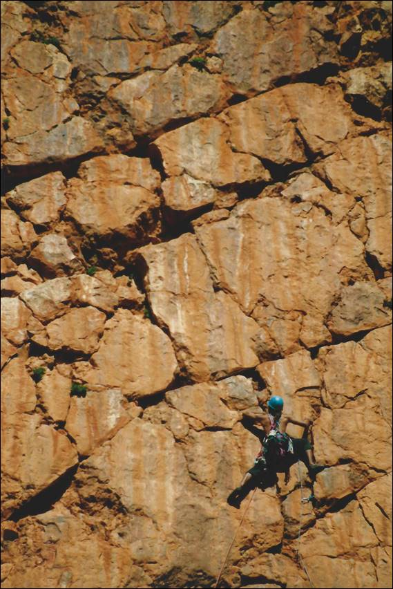 Of the routes established here The Fight To Be Free reminds me of why I am such a fan of traditional climbing. Mark had spied it and worked the moves trying ground up and failing, and when we returned some time later there were bolt holes ready to be filled with steel. Mark was a bit put out so with a fire burning inside he bagged the line and the bolts were never placed. It’s an amazing line and has a hard direct finish that we never managed, and I’ve not heard if anyone has done it. Despite my love for trad I have to admit that we did put a few bolts in some other lines here ourselves, Mark got a gullible bunch of (mostly) girls to drag a generator up to this wall which is no mean feat. He then proceeded to fully bolt One for the Girls, while Pat and I established two mixed routes using what I like to think of a more traditional approach of hand drilling. It was hot work but the hard rock yielded quite easily to the drill and hammer. We created Spooked that I have sadly heard has had bolts added to make it completely sport. I heard this in an article about the area, and the author was whinging (quite a lot) about how he couldn’t even get off the ground on that line. I had said in the guide it may be under-graded and maybe that was an understatement. Pat created Come On Face! Which he is inspecting above and on which he placed two hand drilled bolts. Personally I reckon his route is one of the best and most consistently sustained hard lines in the centre: