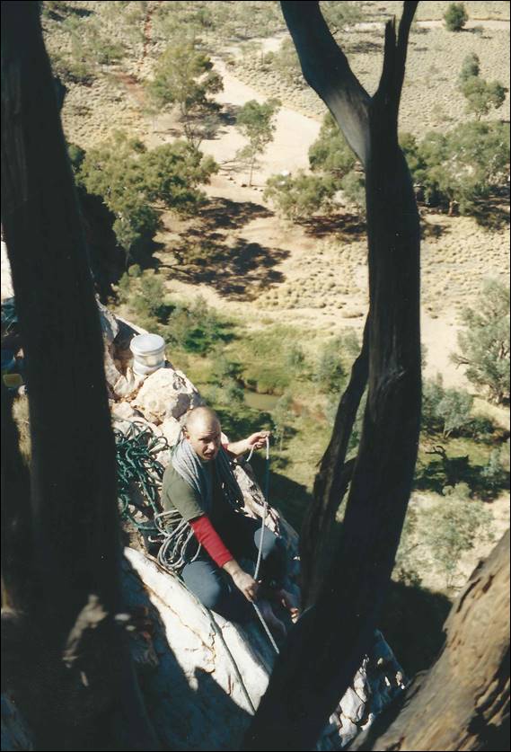 I had kept a record of the 150 plus routes I had been involved in putting up, as well as countless new routes by others. In addition there were also many historical records that had been kept by a few motivated individuals over the ages and rather than retype them and miss anything I contacted as many people as I could to get info. There was one key issue with collating the previous records of climbing activities. Not Goshen, he had his website so that was easy. It was Jock, who I had nabbed that route from at Blatherskite (Ilparpa) Range. Views about the need or not and risks associated with publishing a guide were greatly varied. Some people were strongly against it, saying it would bring the sort of attention that would end in access being denied to climbers and Jock was one of those. They had a point as there are a great many local issues and there is also an absence of policies to ensure continued access. Others, including myself, thought the guide would set a bench mark for future discussions on access. Another benefit would be to allow both local and visiting people to learn more of the issues peculiar to the area, and hopefully be respectful of these. I eventually managed to convince Jock to part with his digital record, which meant I didn’t have to retype everything and that was partly helped (I’d like to think) when we gave him the fridge from our campervan. I gutted the van and rebuilt it in a way that was more practical for Lisa and I. When the heat really turned up in the centre the gas fridge couldn’t keep up, so we decided to ditch it. I might add at this point that I also contacted several eastern states climbers who had graced the area but I never got a response from any of them except Glenn Tempest who even provided a few images:
