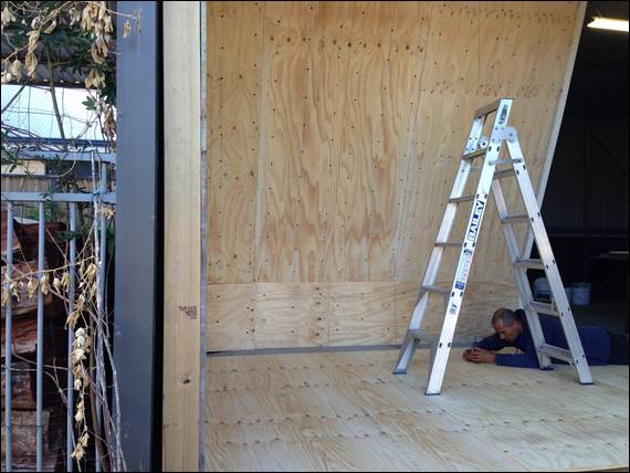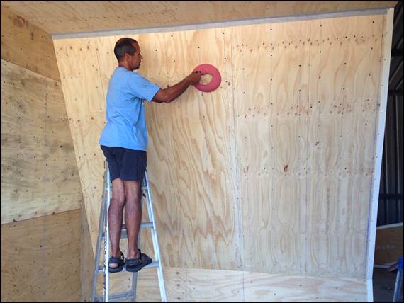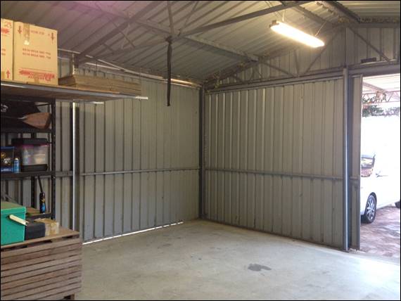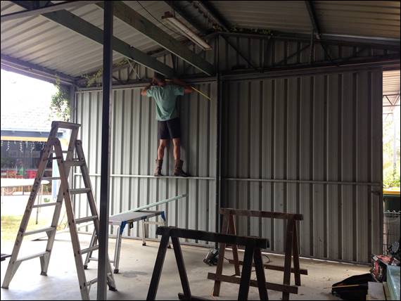 As you can see above I went to painstaking levels to make sure when I cut the roof panels they were the right size. That included plumb-lining the top edge of the overhang, as the pre-made frames I had received were not quite the same dimensions. Then just two sleeps before Christmas Craig came over to help get the roof panels up and then all that I needed were the holds: