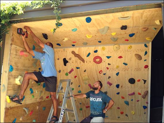 We played the traditional follow on game and while Craig and I ventured out onto the roof, that really didn’t get as much attention as the other walls. Just like at Lou’s wall we seem to have an issue with dogs wanting to lounge about on the mattresses below where you are climbing: