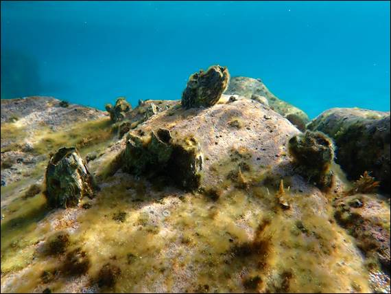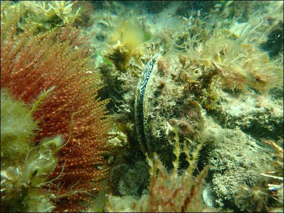 It cleared up a few hours later so I went back out. With the sun penetrating the water, when I went down, I was able to see some cool things. I found another razor shell, camouflaged with weed growing all up its sides. Bobbing about on the surface some three to four meters up it is hard to spy these, so sometimes it pays to just keep ducking diving up and down to see what you might come across: