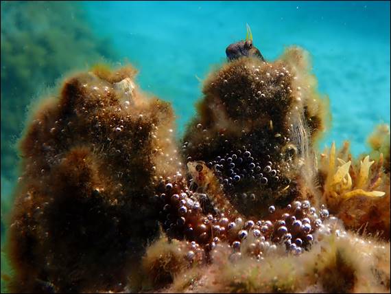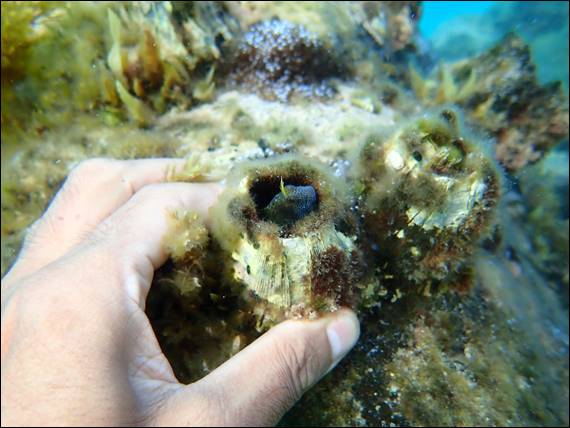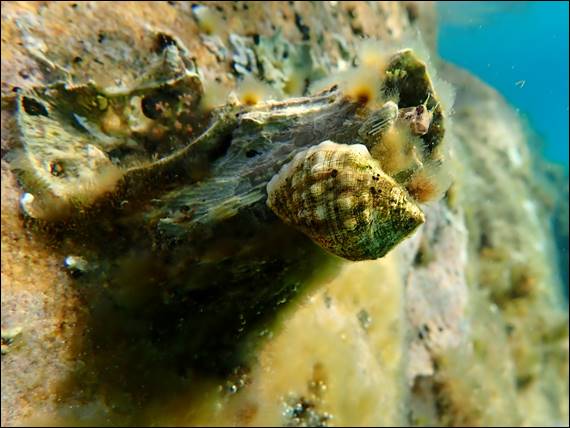 At my beach the bommies are limestone with lots of, crack, pockets and caves but these are made from smooth granite boulders. These large barnacles don’t have an issue with sticking to the smooth surfaces and when they die off the shells make the perfect home for other creatures. I’ll take a stab in the dark and say this is a Coral Shell, but what really caught my eye was the Blenny living inside the barnacle: