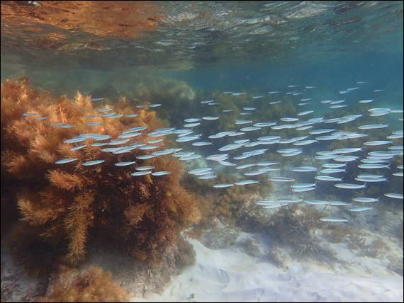 There were many big shoals of fish, and out above the sandy bay were thousands of bait fish. It’s easy to see why this place is a favourite for people fishing. So one more image from Castle Rock of a shoal of small but very pretty fish. These seemed to change colour, as they swam past. A great way to leave these waters, as I made my way back to the others who were climbing, fishing and/or just chilling on the rocks: