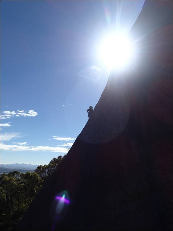 The timing was perfect and we were trudging up the rocky slabs and bashing through patches of bush, while the morning light was hitting the mighty Gibraltar Rock. I’ve done one great 200m route on this massive monolith, which was our original destination some four weeks back. However, with long runouts and the reduced opportunity for retreat should the rain come in we decided to go for the neighbouring and recently developed smaller crags of Angwin Peak: