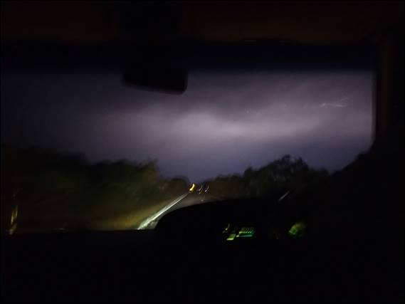 As the darkness fell so also did the first drops of rain. We had a cuppa as we watched the rain slowly get heavier, and agreed that we would still head to the Stirling Ranges. If it was too wet to climb in the morning, then the place would offer great walks. We drove northwards in the big bus, as the sky lit up like daylight and then darkened back to night time due to an amazing lighting storm. Despite this image being a tad blurry I couldn’t resist including it as I managed to capture an image of this horizontal strike, one of the many lighting strikes we were lucky to see: