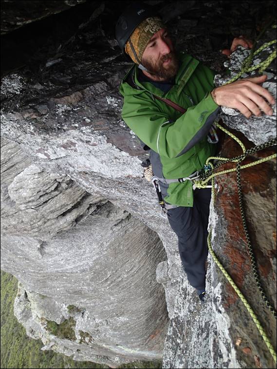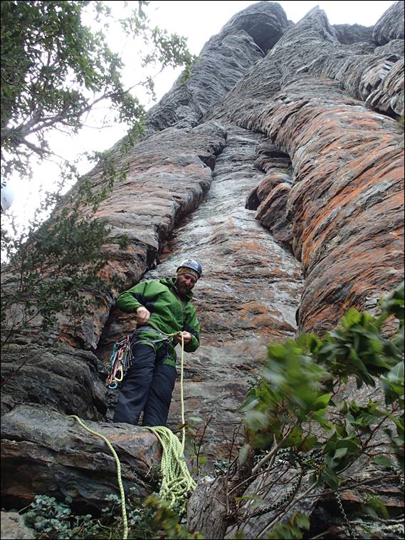 Howsie started the proceedings with a beautiful clear sky stretching out west, which is where the rain was due to come from. While the sun was warming the wind was very fresh and so we were rugged up. I took my twin ropes, which hadn’t seen the light of day for quite some time. They were useful having three of us and also made it easier getting off, as we could do a single abseil. In hindsight we should have taken another rope to leave set up as a rap line, but we were not in any great rush so that wasn’t a biggie: