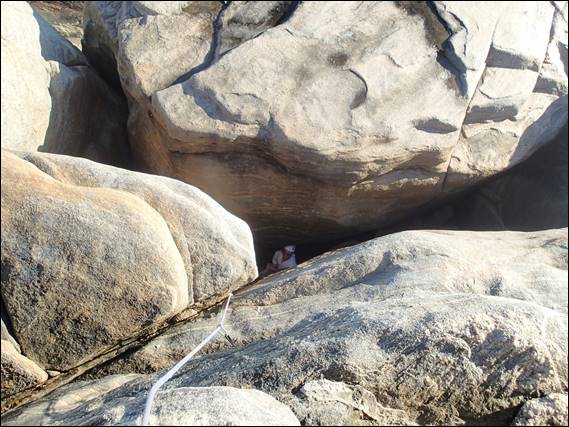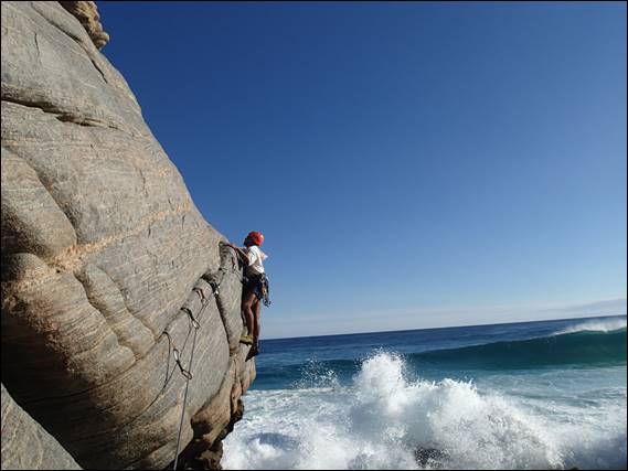 It wasn’t timed completely perfectly, although I have to confess I really did take my time for no other reason than to experience the water lapping at my feet. The rope in the following image belies where I climbed as I traversed into the blocks quite low down. I got a wee bit wet but it wasn’t too bad, as I was only hit by the spray and not the full wave. From the angle we had seen the route the arête could have thrown anything at us, so I was a little nervous to start with, but needn’t have been, after all didn’t I say Moses was a friendly place: