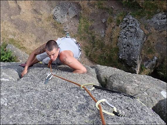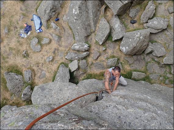 Hound Tor is a collection of outcrops, almost like a little castle wall defending the hill top. When we first got there I won’t deny I didn’t think the place had much to offer. However, the more we climbed the more the place grew on me, the routes were sustained and good quality and the rock, well it’s solid granite! So as the day wore on I started to spy more and more lines that looked appealing: