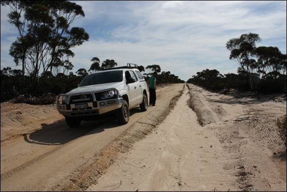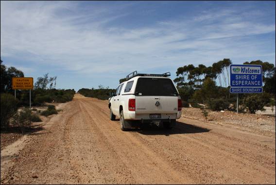 After Lake King there is another 200km’ish to go, of which 180km is a gravel road. The first 90km of this stretch is like a highway and you can cruise with confidence at 100 km/h. Then you hit the boarder where the Shire of Lake Grace meets the Shire of Esperance, and suddenly this awesomely maintained gravel road becomes an “unmanaged” track in the words of the Shire of Esperance staff. They even have a warning sign and state that they very rarely maintain it. Our speed dropped dramatically and we had to weave round numerous large potholes: