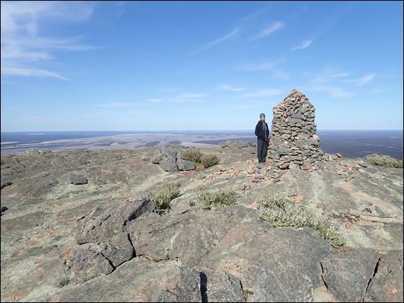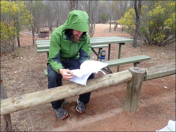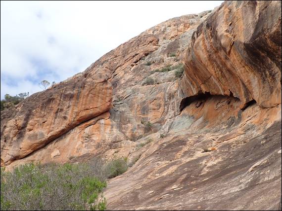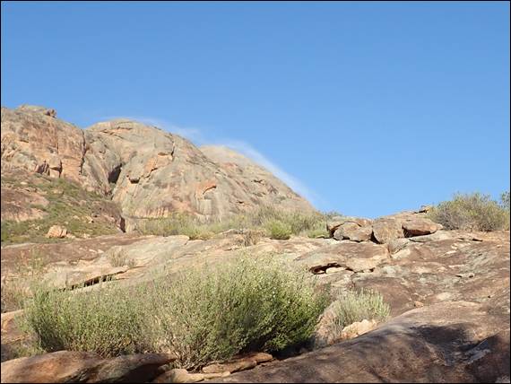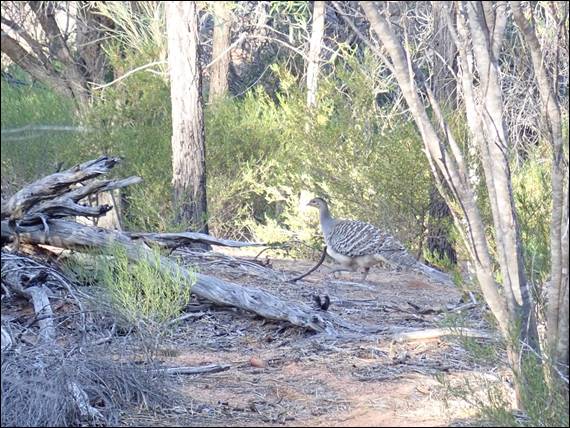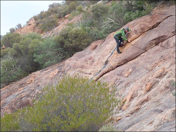 Then it was an hour walk back down, and while doing so looking for an elusive climb that a friend of Nadia and Howsie had been involved in putting up. The description says it’s on a prominent boulder and there is only the one route of an obvious crack line, it is not however shown on the topos so locating it was hard work. In fact it was impossible and we looked every day but failed to find it. On this day we did however see a Mallee Fowl, which kept an even distance from us but didn’t run away. As Howsie was scanning the boulders to find the climb I stalked the Mallee Fowl through the scrub all the way back to the campsite, from where it headed back into the bush: