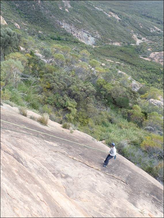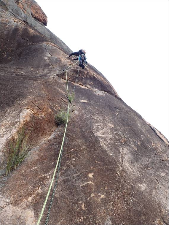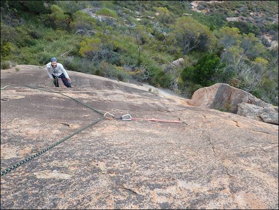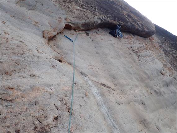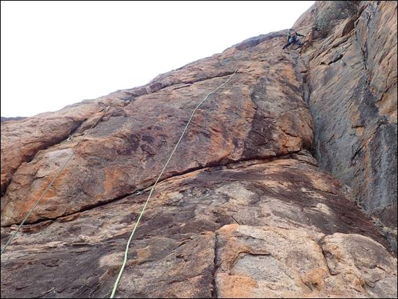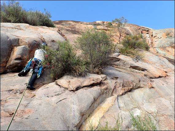 So there was nothing to do but to start packing the gear up for another trip up the hill, and back to another climb I’d previously done. It meant yet another walk from the camp to the crag, but this time we could travel slightly lighter with a single 60m rope and no water or food. We were also getting used to the area and knew the better paths to take, avoiding as much bush bashing as possible. We were also getting more confident in bouldering up and down some of the steeper terrain: