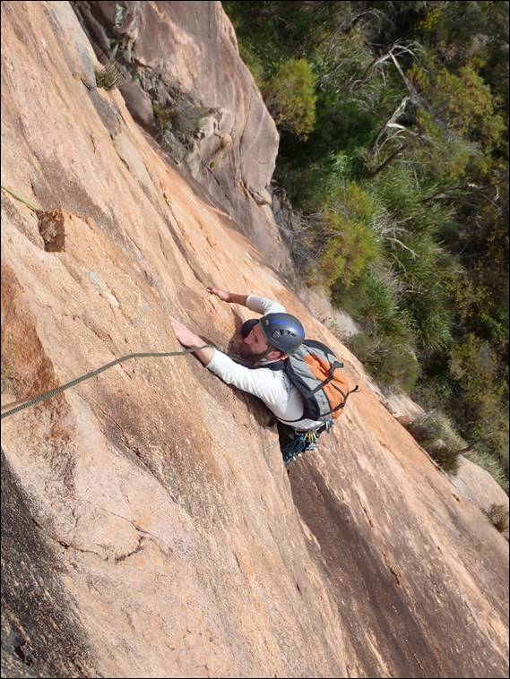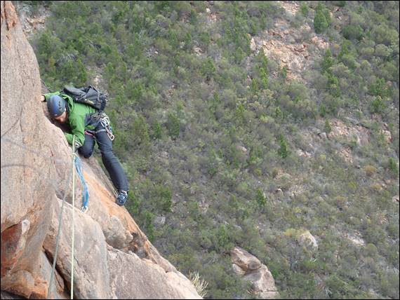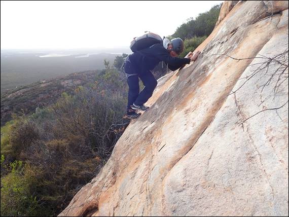 Today we were heading further to the north which meant a longer walk in and even more bush to force a path through. We thought we were getting better at sussing out the line of least resistance, but missed the target and then had to traverse the base for a long way. To avoid the vegetation, at places we decided to boulder above the vegetation and eventually we managed to get to the base of Conquistador. This 300m route would take us all the way to the summit, so again we would need to climb with packs:
