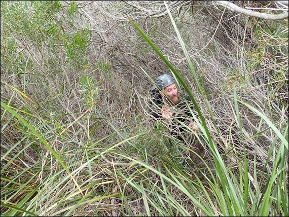 Our second climb was one I had not been on and I had heard great things about it. However, to get there we had to bush bash out, walk round and then bush bash back in. It was hard work and despite the sun having gone behind the clouds we worked up a sweat as we crashed our way through a thick matrix of reeds, dead fallen trees, and live bushes some of which were covered in thorns. We kept telling ourselves this was all part of the fun: