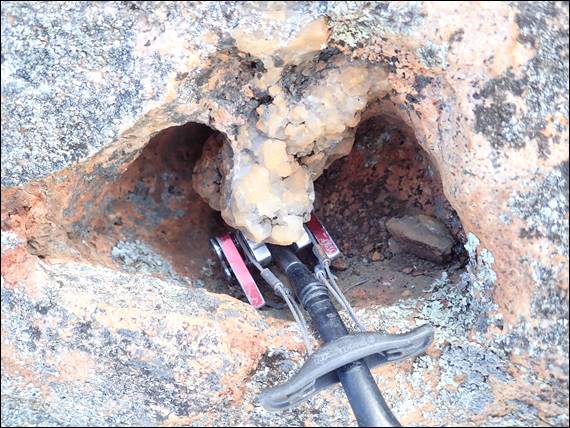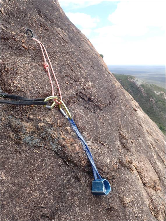 I took pitch two and was very keen to make use of my new piece of gear. My sister is friends with an old school climbing legend of the UK. Geoff Milburn helped pioneer a number of places in the UK and also until recent years had the largest known UK collection of climbing and mountaineering literature. He auctioned the amazing 5 tonnes of books, a sight I was lucky enough to see. His collection comprised wall to wall bookshelves in his garage, with books three deep. It was epic and overwhelming. Anyway as part of a more recent clear out I was given a few pieces from his climbing rack, including the sky hook which is the last piece of gear below: