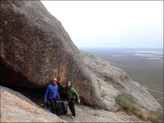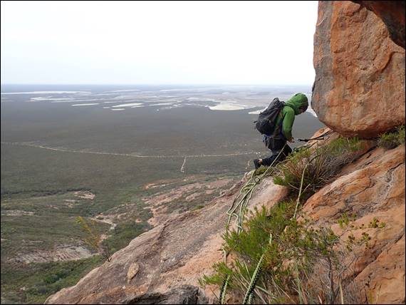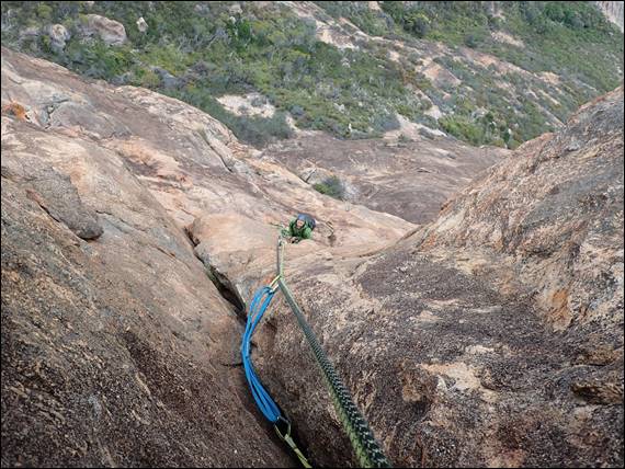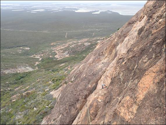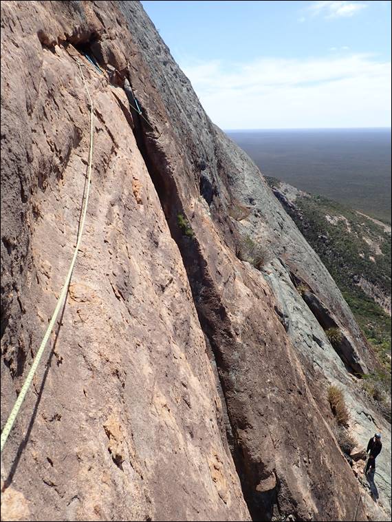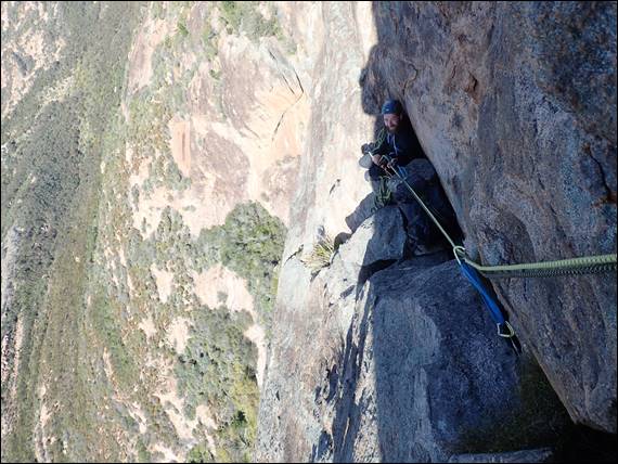 Gear wise we took everything from micro wires through to house brick hexes and amazingly used the full range on many pitches. Some pieces of gear placements looked more favourable than others and some you simply had to use just for the shear novelty factor, such as the cam placement above. No doubt some people will give me grief for that one but it simply had to be done! Being so high up we constantly had wedge tailed eagles flying above and around us, so while the belay stances could be cold there were great views out and the majestic eagles to watch: