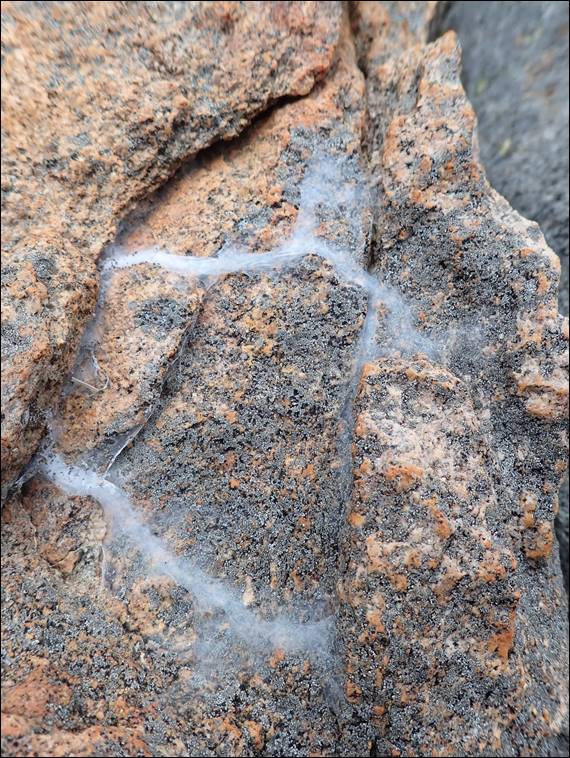 While he edged his way up very slowly, I sat in a comfy belay out of the wind looking at the little web formations that seemed to be all over the place. I’m guessing spiders, and you could tell where their houses were. From there they made protective walkways covered in the fine webby canopy. From a distance is looked like chalk marks, but up close they looked a little ghostly and spooky: