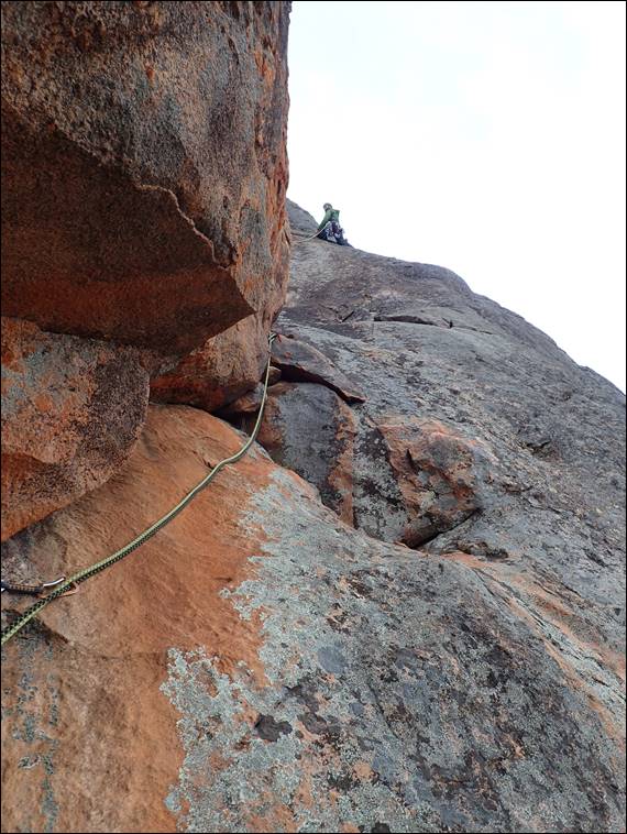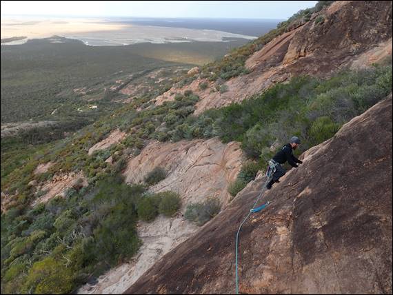I then looked out and could see rain was coming, it seemed the forecast had mislead us and there was a chance we could get rained on while climbing. Howsie made his way to the belay looking pretty cold and weary. We discussed our options and decided to change tact and finish up the easier climb called Last Tango in Widgiemooltha, which crossed at where I was belaying. Neither of us fancied being drenched on the steeper climb: