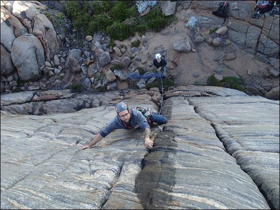I’ve been working out on my wall and was quite content to allow Rongy, who had been away on a (non-climbing) road trip for some time and Andrew who had only just recently got back into climbing, to bag some leads. So next up Rongy decided to take on a very fine line, and one that requires a very calm approach as the first piece of gear is high up and the landing is not very inviting. Seeing he would probably push us down the slopey rocks with him we decided not to spot him. Any guesses as to what the climb is before you scroll down to the next image:
