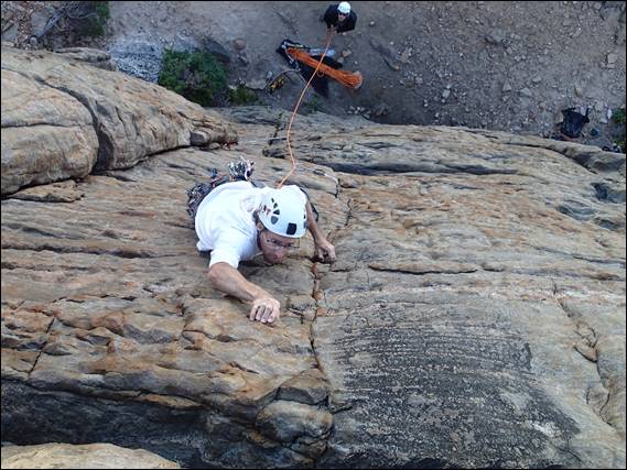 I rapped back down and sat halfway down the wall to watch Rongy work through the crux sequence. It’s at an overhung section, both hands are on a crimpy rail and you have to smear your feet and make a long reach up to a couple of slightly bigger crimpy holds. It looks like, and feels like, a big move. Us shorties have to work that a little harder at this section and Rongy does a bit of a dynamic move to get through it: