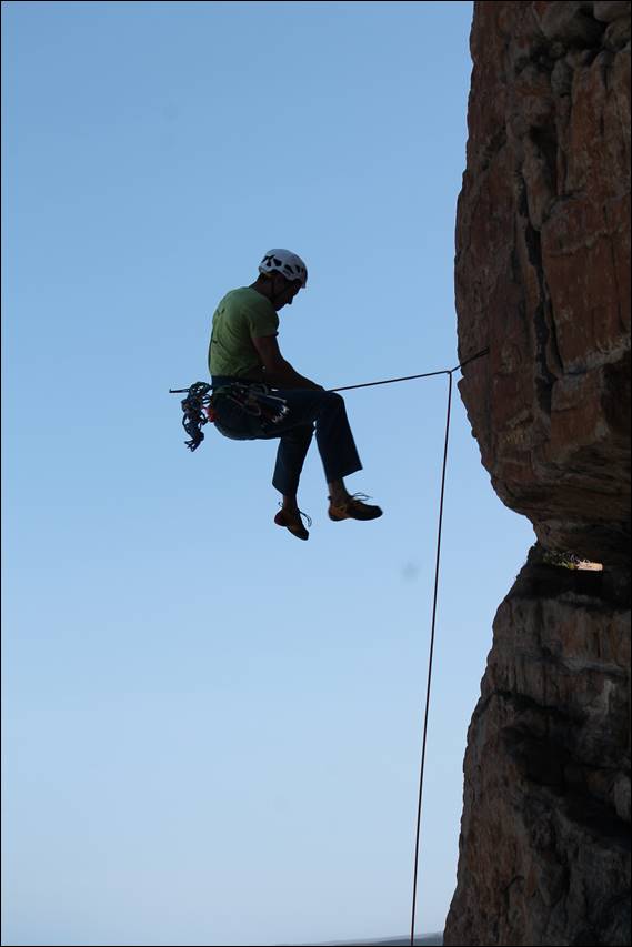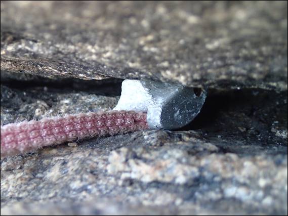 Before getting back down I couldn’t resist checking out Steve’s insitu gear, it looks like the pin in starting to rust but I’m sure it still gets used. Then it was my turn on the big line, which I have only been on a couple of times many years back. I was somewhat nervous and can safely say my arms felt like lead and my finger tip were on fire as I worked my way up. When I topped out I flopped on the ground exhausted and hurting, it was a top lead by Wiggins: