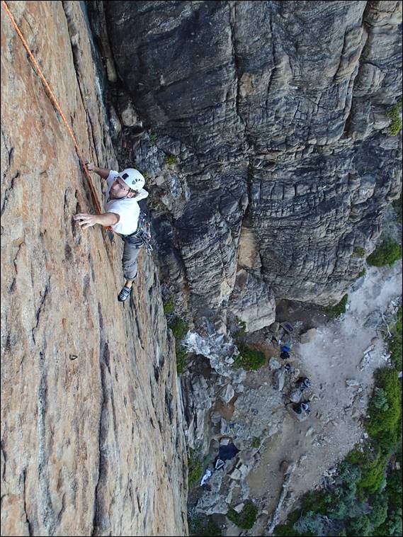 Rongy kept up the tri-cam only approach. Like me he only took tri-cams up so there was no ability to be tempted to slip in wires in those places that we knew from past experience were just perfect. This meant that we had to hang onto the holds that bit longer fiddling in the gear, which is probably not a bad thing. We have many of these lines dialled and so it was good to slow us down so we could appreciate them that bit more: