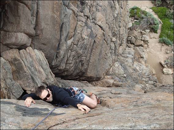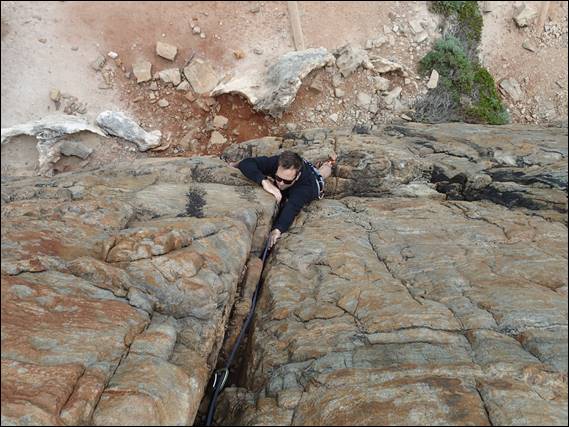 Sinuosity proved that little bit trickier than I expected and the gear was also a little sparse. If I had cams (big ones) there would have been ample gear, but I didn’t so it made it a very cool climb to finish on. Dean had trouble with a wire low down in the initial crack, so I told him to leave it and enjoy the climb. I was hoping he would manage sixth clean ascent, and he almost didn’t as the last few moves get a bit more technical and fingery and he was hurting: