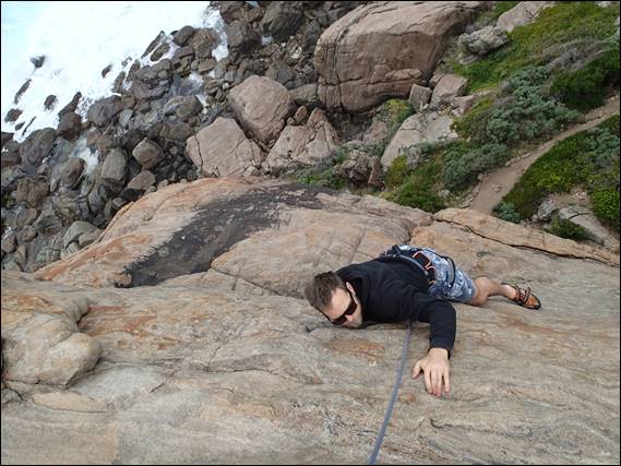 While Mick still wasn’t showing any signs of bringing down a tour group we jumped on another fun line he usually makes use of. Seeing how well Dean had cleaned the last climb the hard way we bumped up the grade a few notches this time on Setting Sun. He was adamant when he looked up that there were no holds, but gave it a crack even going for the fingery direct start. He then proceeded to cruise past the crux moves: