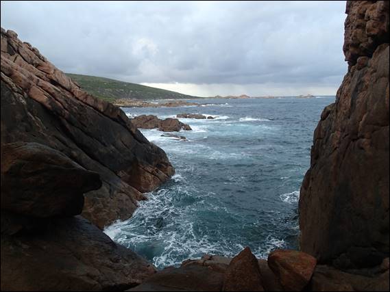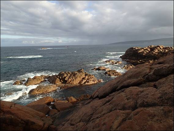 It came down hard and the rock, gear and rope were all sopping wet. Both Howsie and I were a bit shell shocked as to how full on the first climb had felt. While we could have blamed the rain we knew that wasn’t entirely it, so we dialled back the grade to make sure we could survive this session with some dignity. The good news was that the bank of rain was passing us over, as we made our way to Murphy’s Boulder out of the zawn and on the seaward side: