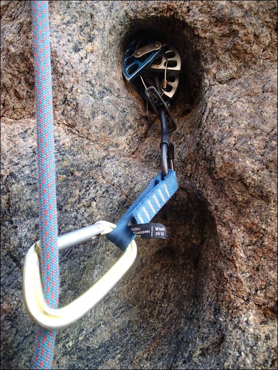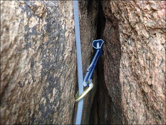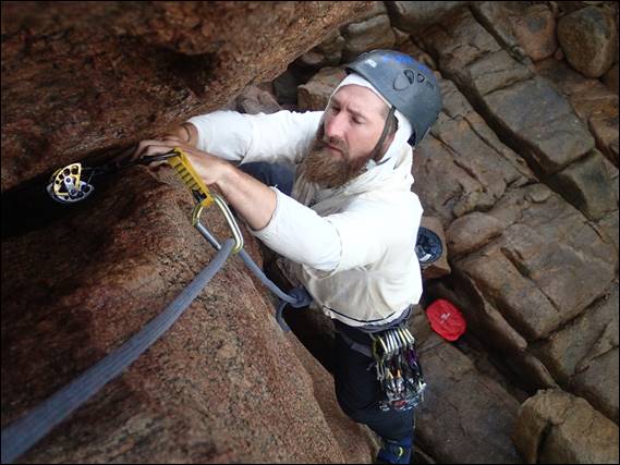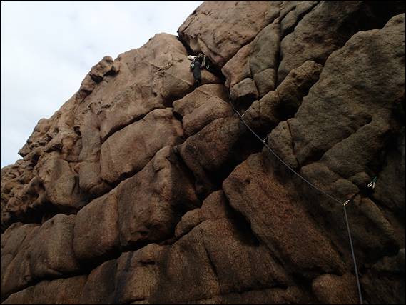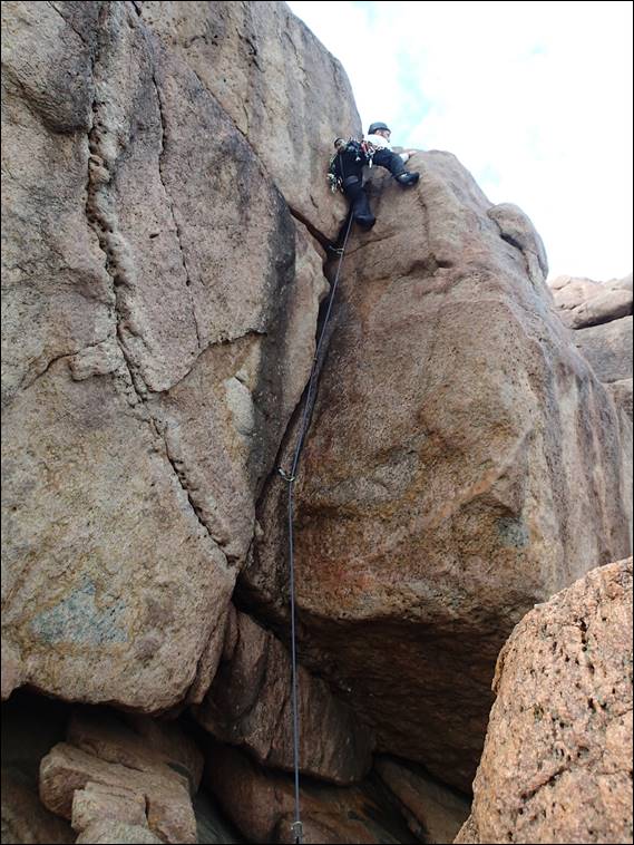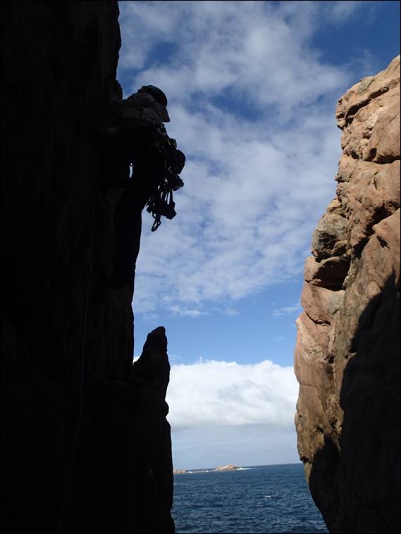 The reason for his one disappearance was the need to place a bomber hex deep in the recess of the crack. I was only just able to reach it, despite climbing the route as Kym had taught me too. The first time I hit this line Kym made a “strong” recommendation/suggestion that for full value you need to get into the crack and worm your way up in very traditional style. Howsie couldn’t help from laughing as I inched my way up with what could definitely not be called style:
