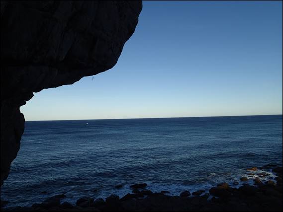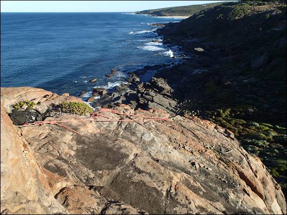 With the thought of a hot day an early start was on the cards for this morning. I had in mind where I wanted to go, but it did depended on who was keen to get out. As it was no one was available so for the first time in a long time I went out by myself. Seeing it was going to be just me I guessed I’d be moving pretty quickly, so I didn’t leave super early. By 6:30 I was all set up and at the base of the first route of the day, looking out to ocean a broken wire hung from Peaches, an aid route I’ve never been on, but maybe next time: