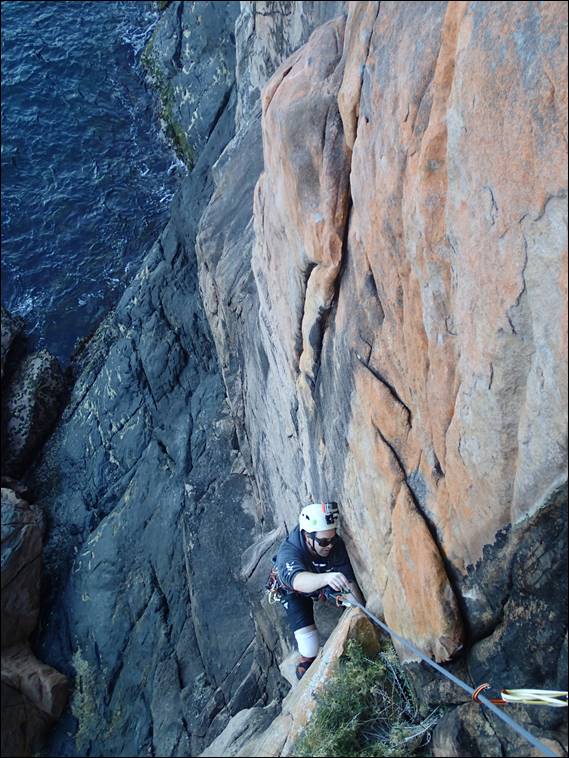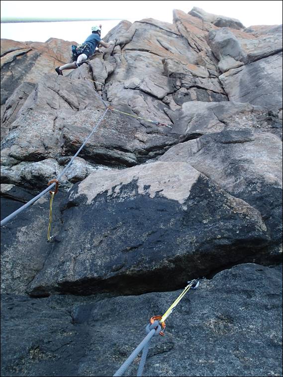 For now Glen and I were aiming to enjoy a chilled climb and the fabulous belay positions with the water lapping just below our feet. This included repeating the very fine Crystal Cut, for which the first third feels like you are climbing up a wall of quartz. Spreadeagled positions and a big reach onto the headwall all the while trying not to allow the crystals to cut you. It feels a little unnerving knowing how brittle quartz can be, making pulling on the holds that bit more exciting: